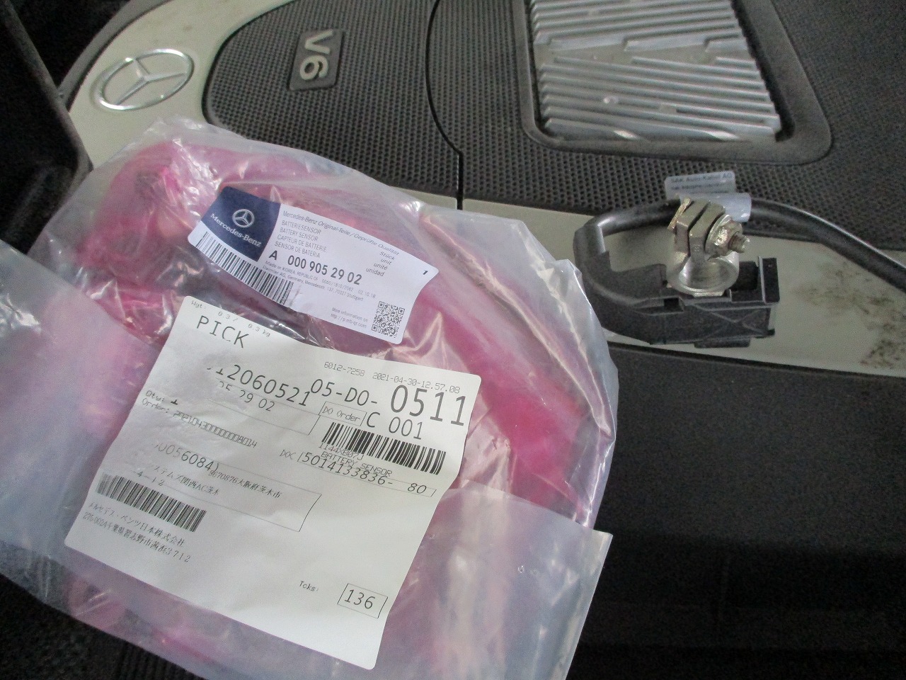 こちらは先日バッテリーセンサー不良で部品待ちが出来なかったクーペの代替えでセンサーを取外していたE300ですが部品が入荷いたしましたので交換いたします。