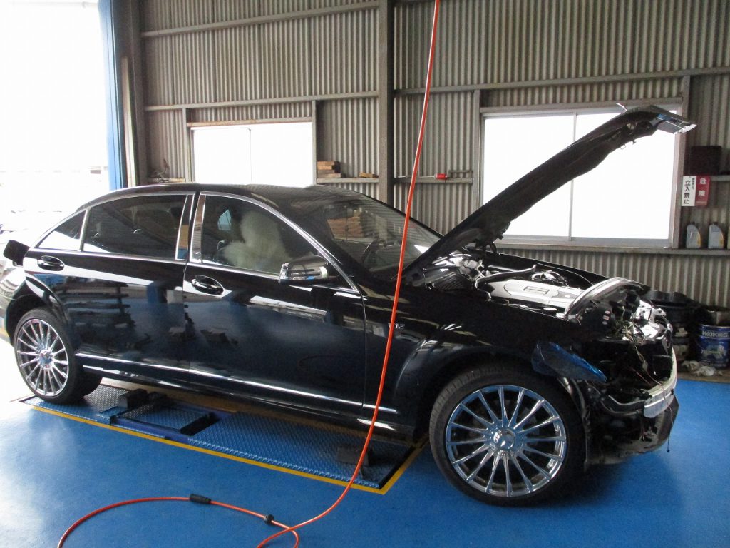 エンジン始動不良たまに掛かる時があるとの事で点検修理に、あと左ヘッドライト不灯・イルミネーションスイッチ取付で入庫中のS500です。